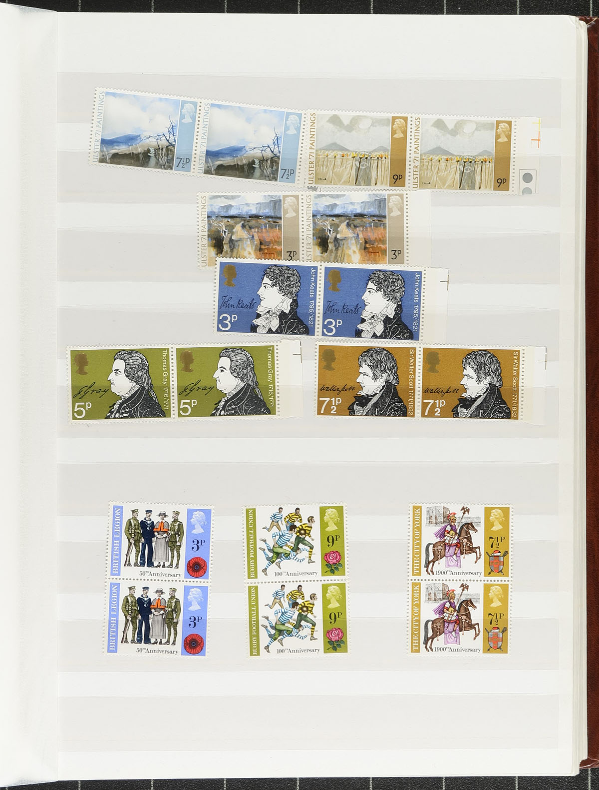 Decimal-era mint, never hinged, commemorative and Christmas selection up to 1999. Includes many complete sets, se-tenant strips, but no souvenir sheets (and no Machins). All neatly laid out in a light (and near-new) brown "Clearview" 64-page stockbook. Includes some 1st and 2nd class material. Over 1,000 stamps, with the lightest of duplication (mostly pairs until 1985). Great to build your modern GB collection, or to break up for postage. The estimated face value is £300.00 = $552.00 CDN. Estimate =