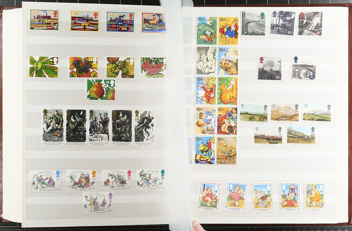 Decimal-era mint, never hinged, commemorative and Christmas selection up to 1999. Includes many complete sets, se-tenant strips, but no souvenir sheets (and no Machins). All neatly laid out in a light (and near-new) brown "Clearview" 64-page stockbook. Includes some 1st and 2nd class material. Over 1,000 stamps, with the lightest of duplication (mostly pairs until 1985). Great to build your modern GB collection, or to break up for postage. The estimated face value is £300.00 = $552.00 CDN. Estimate =