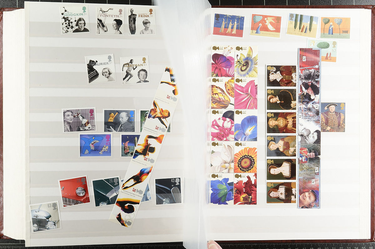 Decimal-era mint, never hinged, commemorative and Christmas selection up to 1999. Includes many complete sets, se-tenant strips, but no souvenir sheets (and no Machins). All neatly laid out in a light (and near-new) brown "Clearview" 64-page stockbook. Includes some 1st and 2nd class material. Over 1,000 stamps, with the lightest of duplication (mostly pairs until 1985). Great to build your modern GB collection, or to break up for postage. The estimated face value is £300.00 = $552.00 CDN. Estimate =