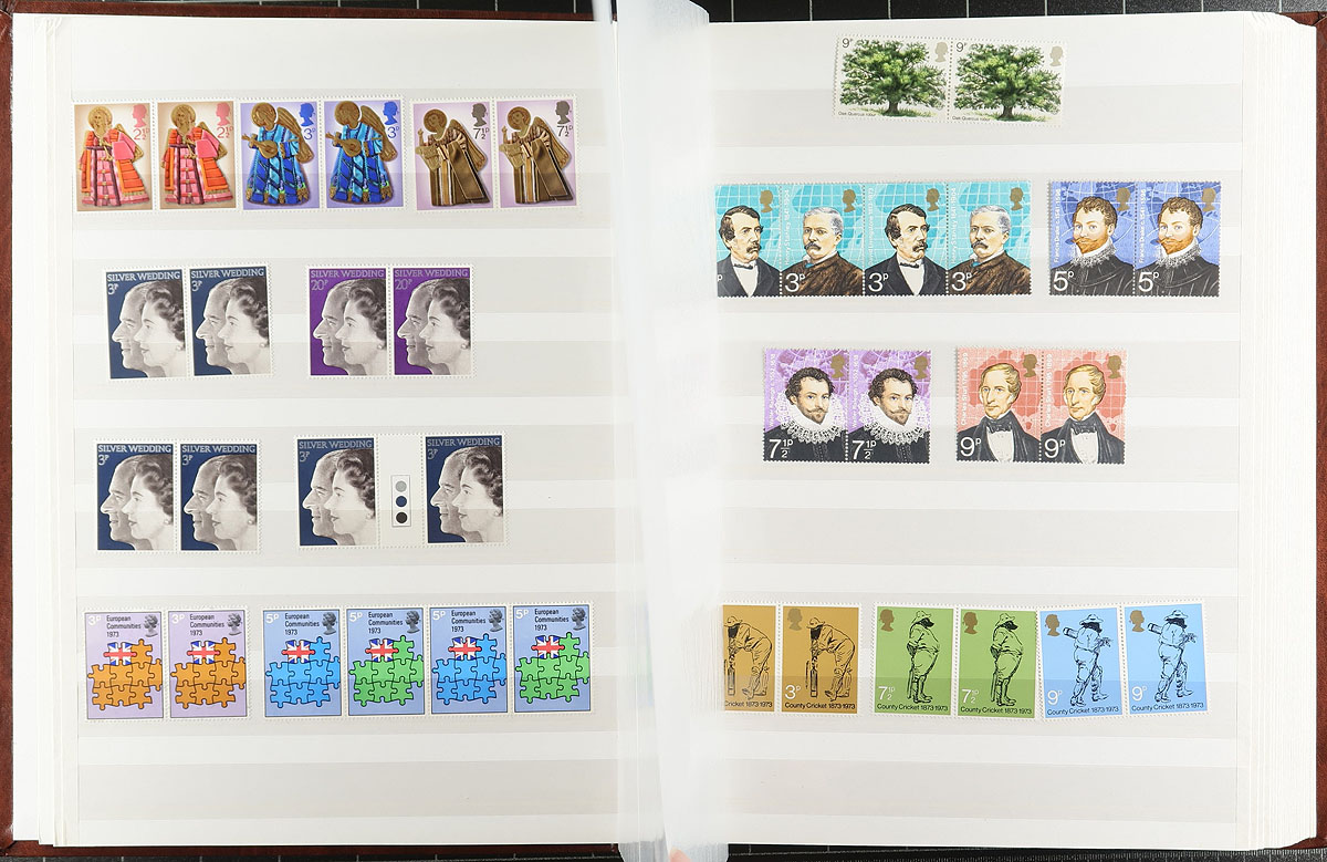 Decimal-era mint, never hinged, commemorative and Christmas selection up to 1999. Includes many complete sets, se-tenant strips, but no souvenir sheets (and no Machins). All neatly laid out in a light (and near-new) brown "Clearview" 64-page stockbook. Includes some 1st and 2nd class material. Over 1,000 stamps, with the lightest of duplication (mostly pairs until 1985). Great to build your modern GB collection, or to break up for postage. The estimated face value is £300.00 = $552.00 CDN. Estimate =