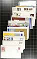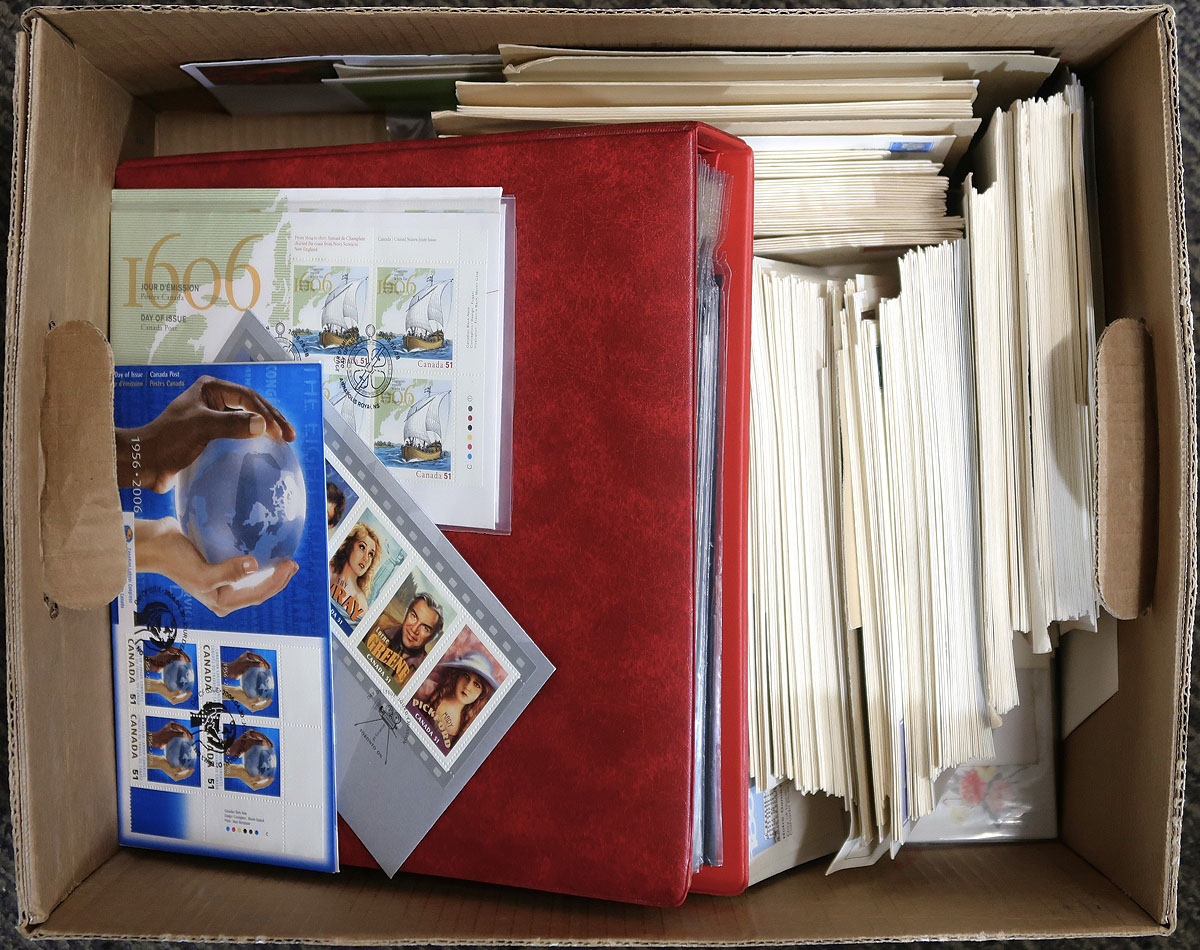 First Day Covers. Group of cachet FDC in a bankers box. Contained in an album, some bundles (mostly different) and loose singles. Ranging from 1967-2006, with strength in Canada Post cachets, although we noted some earlier BABNCo cachets. There are substantial quantities of plate blocks (mostly one position) and most are unaddressed. A very clean group. Several hundred covers here, some duplication to be expected. Enormous face value and original cost. Estimate =