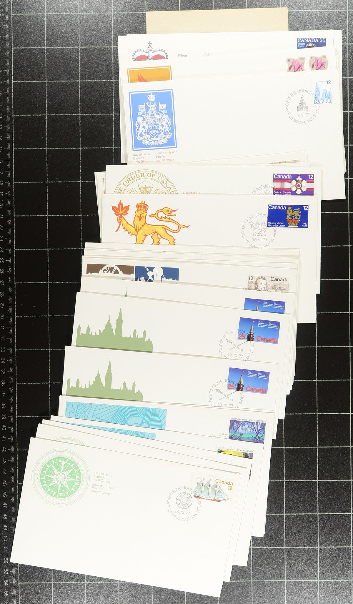 First Day Covers. Group of cachet FDC in a bankers box. Contained in an album, some bundles (mostly different) and loose singles. Ranging from 1967-2006, with strength in Canada Post cachets, although we noted some earlier BABNCo cachets. There are substantial quantities of plate blocks (mostly one position) and most are unaddressed. A very clean group. Several hundred covers here, some duplication to be expected. Enormous face value and original cost. Estimate =