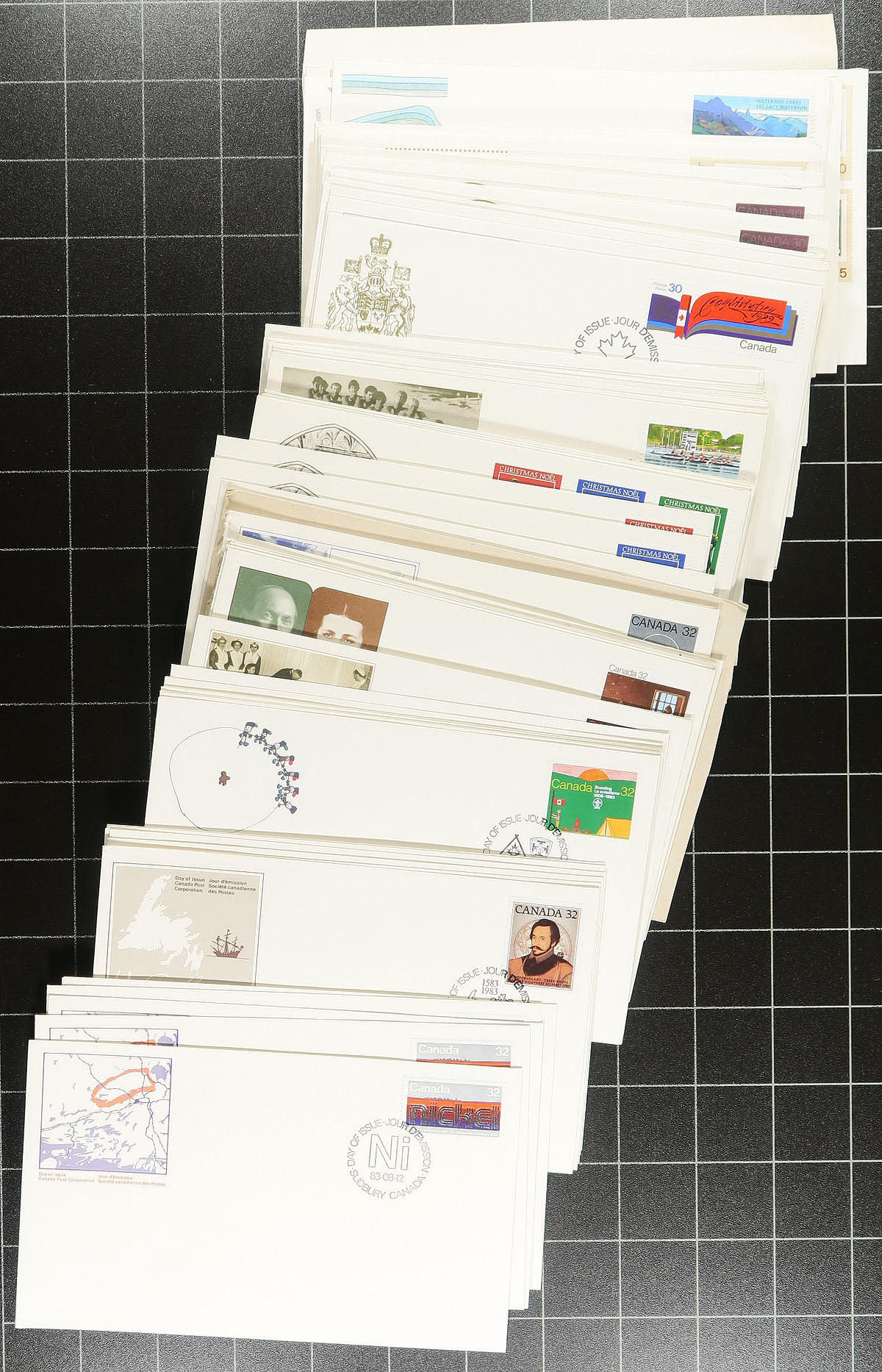 First Day Covers. Group of cachet FDC in a bankers box. Contained in an album, some bundles (mostly different) and loose singles. Ranging from 1967-2006, with strength in Canada Post cachets, although we noted some earlier BABNCo cachets. There are substantial quantities of plate blocks (mostly one position) and most are unaddressed. A very clean group. Several hundred covers here, some duplication to be expected. Enormous face value and original cost. Estimate =