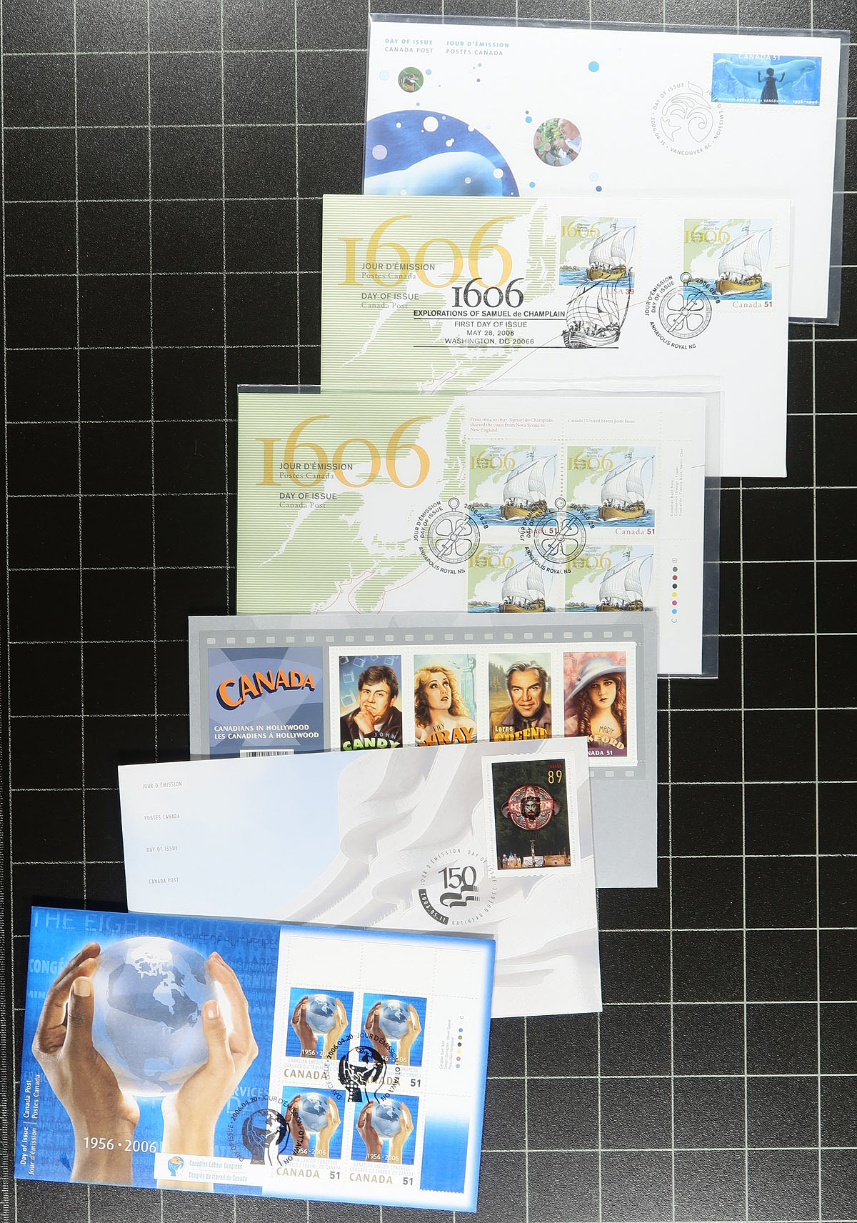 First Day Covers. Group of cachet FDC in a bankers box. Contained in an album, some bundles (mostly different) and loose singles. Ranging from 1967-2006, with strength in Canada Post cachets, although we noted some earlier BABNCo cachets. There are substantial quantities of plate blocks (mostly one position) and most are unaddressed. A very clean group. Several hundred covers here, some duplication to be expected. Enormous face value and original cost. Estimate =