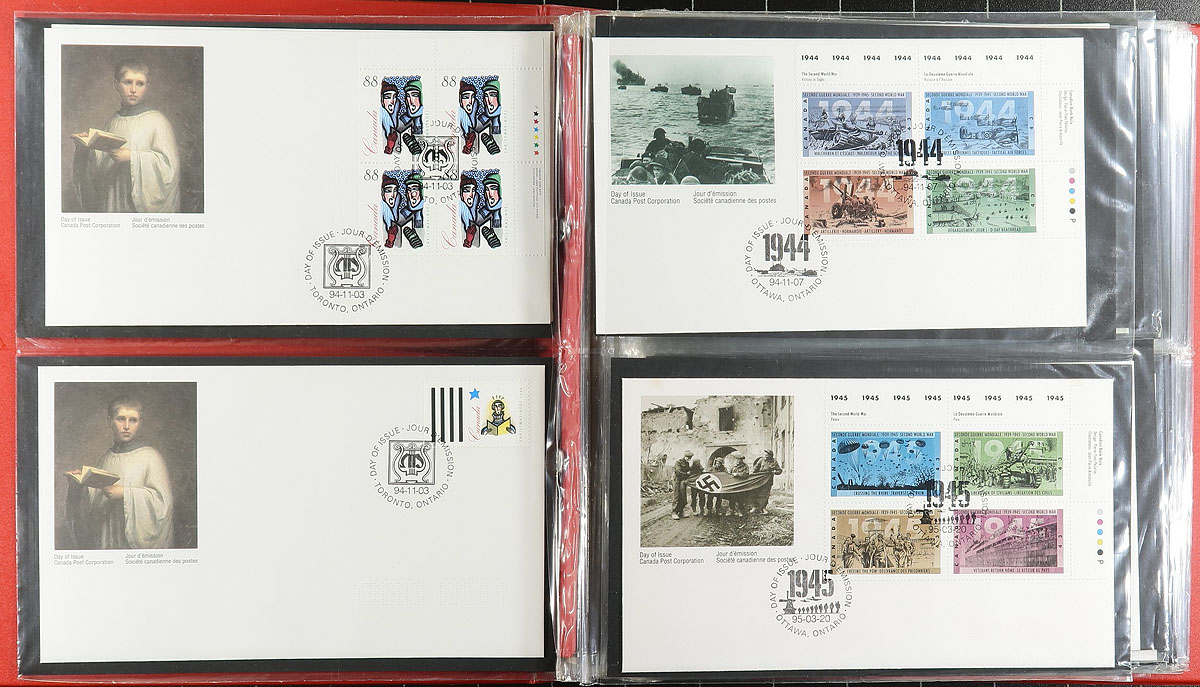 First Day Covers. Group of cachet FDC in a bankers box. Contained in an album, some bundles (mostly different) and loose singles. Ranging from 1967-2006, with strength in Canada Post cachets, although we noted some earlier BABNCo cachets. There are substantial quantities of plate blocks (mostly one position) and most are unaddressed. A very clean group. Several hundred covers here, some duplication to be expected. Enormous face value and original cost. Estimate =