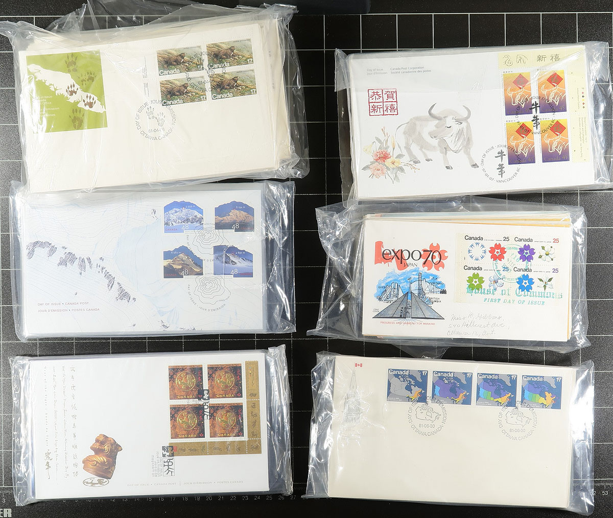 First Day Covers. Group of cachet FDC in a bankers box. Contained in an album, some bundles (mostly different) and loose singles. Ranging from 1967-2006, with strength in Canada Post cachets, although we noted some earlier BABNCo cachets. There are substantial quantities of plate blocks (mostly one position) and most are unaddressed. A very clean group. Several hundred covers here, some duplication to be expected. Enormous face value and original cost. Estimate =