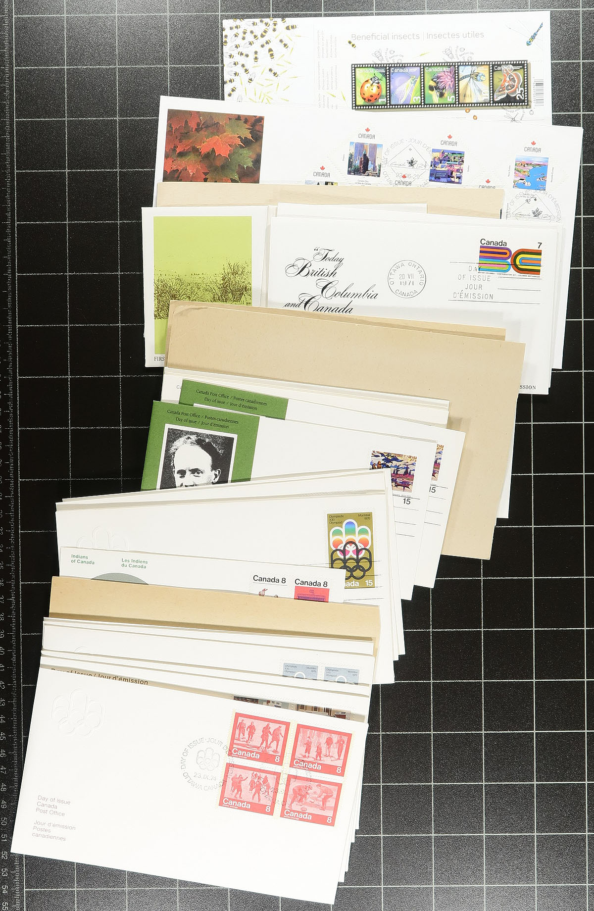 First Day Covers. Group of cachet FDC in a bankers box. Contained in an album, some bundles (mostly different) and loose singles. Ranging from 1967-2006, with strength in Canada Post cachets, although we noted some earlier BABNCo cachets. There are substantial quantities of plate blocks (mostly one position) and most are unaddressed. A very clean group. Several hundred covers here, some duplication to be expected. Enormous face value and original cost. Estimate =