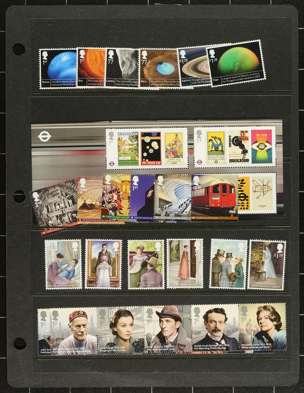 Modern mint commemorative assortment #1: 2002/2004 and 2012/2015 on four pages plus a bundle of 2012 Paralympic athlete duos. All mint, never hinged, all different, in complete sets and some se-tenant strips, with two souvenir sheets. Huge value here bolstered by 143 "1st" rate stamps. Perhaps a way to take a bite out of the high cost of British "new issues". Total face value £315.28 = $580.10 CDN. Estimate =