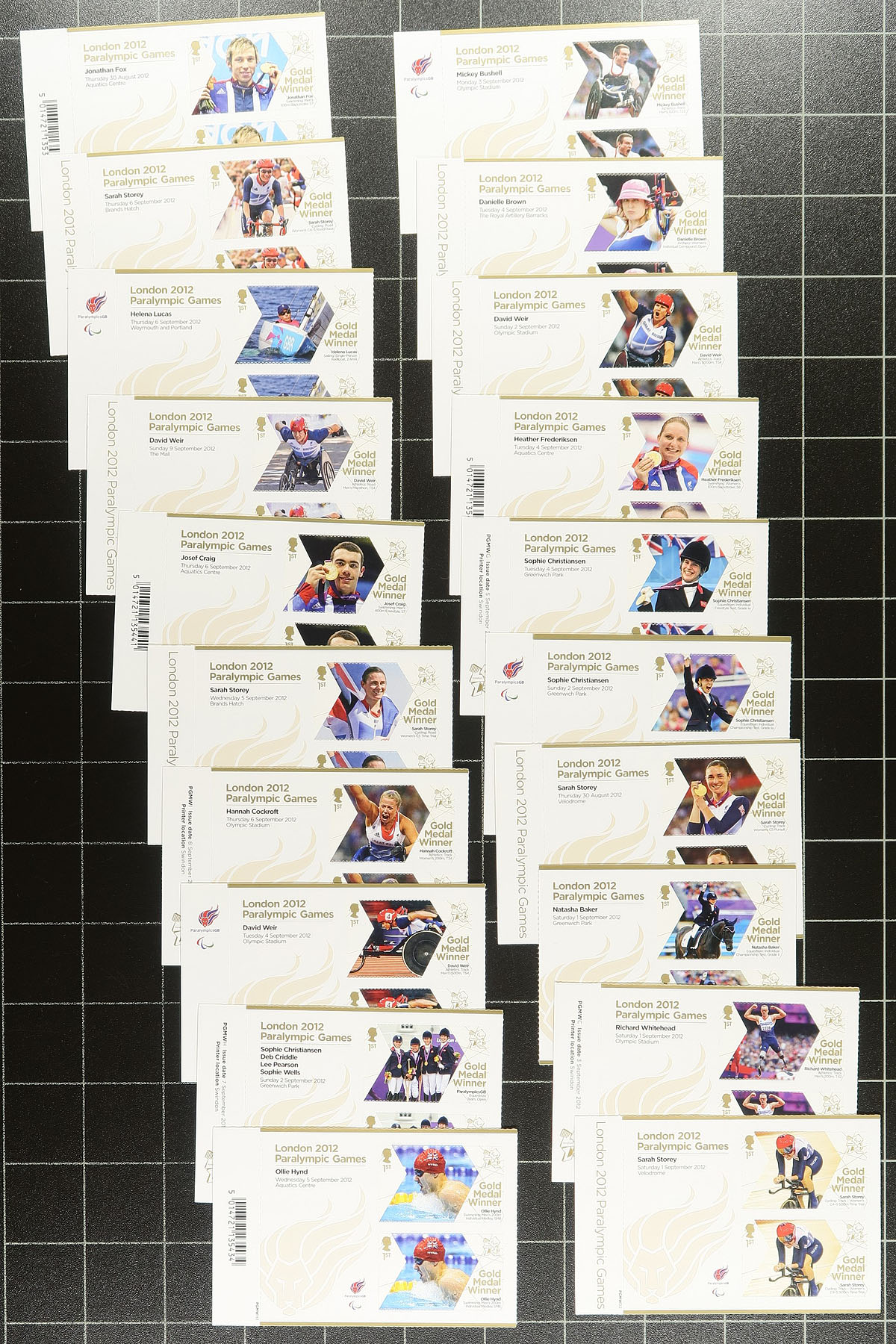 Modern mint commemorative assortment #1: 2002/2004 and 2012/2015 on four pages plus a bundle of 2012 Paralympic athlete duos. All mint, never hinged, all different, in complete sets and some se-tenant strips, with two souvenir sheets. Huge value here bolstered by 143 "1st" rate stamps. Perhaps a way to take a bite out of the high cost of British "new issues". Total face value £315.28 = $580.10 CDN. Estimate =