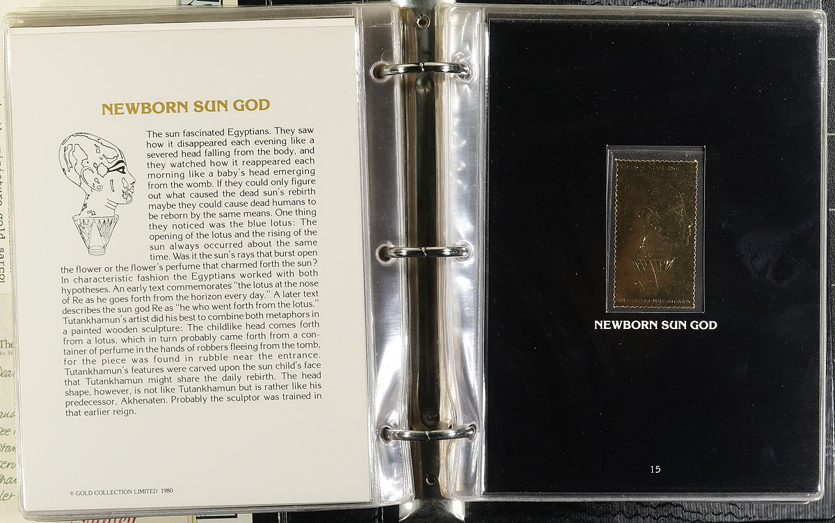 Three Kings (with some family). Includes Tut, Charles and Elvis. These are all commemorative albums that were marketed with an investment edge to them, meaning the purchasers took a bath. But because there is some artistic and philatelic interest, you can pick them up 40+ years later at a fraction of their original price. The King Tut gold foil stamps were produced for the non-UPU Staffa Island (Scotland), and 40 productions are individually described in two custom-made binders (original cost US$800.00!!!). The "King of Rock and Roll" includes a Postal Commemorative Society folder and a couple that are in the size and shape of a vinyl record (they might be duplicates), and a few commemorative covers (mostly focused on the US Elvis issue). The balance is from the British Royal Family with stamps (1972 Wedding anniversary - White Ace, 1977 Silver Jubilee - White Ace, 1977 Silver Jubilee (booklets) - Prangnell, 1977 Silver Jubilee Royal Caribbean tour, 1978 Coronation Silver Jubilee - sheetlets of six, 1981 the future King (Charles) and Diana Wedding). First Day covers are 1977 Silver Jubilee - one booklet of "official" first day covers, the other with "Westminster Collectors Society" cachets and ending with about 15 FDCs from the 1982 Royal Wedding Anniversary. Estimate =