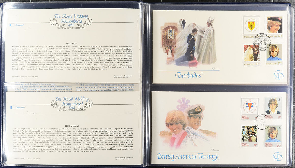 Three Kings (with some family). Includes Tut, Charles and Elvis. These are all commemorative albums that were marketed with an investment edge to them, meaning the purchasers took a bath. But because there is some artistic and philatelic interest, you can pick them up 40+ years later at a fraction of their original price. The King Tut gold foil stamps were produced for the non-UPU Staffa Island (Scotland), and 40 productions are individually described in two custom-made binders (original cost US$800.00!!!). The "King of Rock and Roll" includes a Postal Commemorative Society folder and a couple that are in the size and shape of a vinyl record (they might be duplicates), and a few commemorative covers (mostly focused on the US Elvis issue). The balance is from the British Royal Family with stamps (1972 Wedding anniversary - White Ace, 1977 Silver Jubilee - White Ace, 1977 Silver Jubilee (booklets) - Prangnell, 1977 Silver Jubilee Royal Caribbean tour, 1978 Coronation Silver Jubilee - sheetlets of six, 1981 the future King (Charles) and Diana Wedding). First Day covers are 1977 Silver Jubilee - one booklet of "official" first day covers, the other with "Westminster Collectors Society" cachets and ending with about 15 FDCs from the 1982 Royal Wedding Anniversary. Estimate =