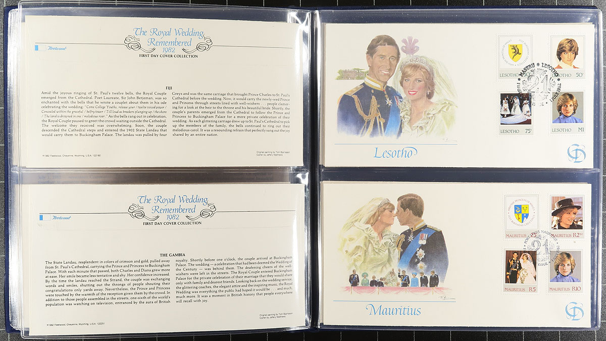 Three Kings (with some family). Includes Tut, Charles and Elvis. These are all commemorative albums that were marketed with an investment edge to them, meaning the purchasers took a bath. But because there is some artistic and philatelic interest, you can pick them up 40+ years later at a fraction of their original price. The King Tut gold foil stamps were produced for the non-UPU Staffa Island (Scotland), and 40 productions are individually described in two custom-made binders (original cost US$800.00!!!). The "King of Rock and Roll" includes a Postal Commemorative Society folder and a couple that are in the size and shape of a vinyl record (they might be duplicates), and a few commemorative covers (mostly focused on the US Elvis issue). The balance is from the British Royal Family with stamps (1972 Wedding anniversary - White Ace, 1977 Silver Jubilee - White Ace, 1977 Silver Jubilee (booklets) - Prangnell, 1977 Silver Jubilee Royal Caribbean tour, 1978 Coronation Silver Jubilee - sheetlets of six, 1981 the future King (Charles) and Diana Wedding). First Day covers are 1977 Silver Jubilee - one booklet of "official" first day covers, the other with "Westminster Collectors Society" cachets and ending with about 15 FDCs from the 1982 Royal Wedding Anniversary. Estimate =