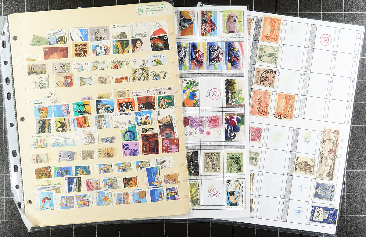 A bundle of former bidboard lots, starting with the earliest "Roos" and King George V "Heads" , going into the early 21st century. Mostly used, with cancel potential and lots of better throughout. Includes some Antarctic Territories (AAT). The mint includes the good brown "Kookaburra" and three gold medal winner sheetlets from the 2000 Olympics. Expect some duplication. The catalogue value of this handful is over US$2000.00. Estimate =