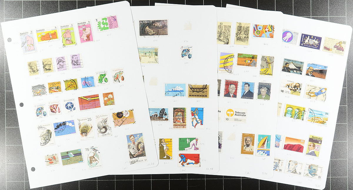 A bundle of former bidboard lots, starting with the earliest "Roos" and King George V "Heads" , going into the early 21st century. Mostly used, with cancel potential and lots of better throughout. Includes some Antarctic Territories (AAT). The mint includes the good brown "Kookaburra" and three gold medal winner sheetlets from the 2000 Olympics. Expect some duplication. The catalogue value of this handful is over US$2000.00. Estimate =