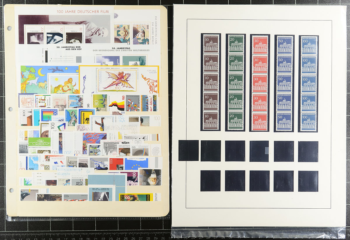 Mint estate bundle. Several former bidboard lots, purchased and then set aside. Mostly late 20th and early 21st century, a mix of hinged and never hinged. In order of appearance, coil strips of 5 of the Brandenburg Gate coils (2 batches, over $400.00 cv in Michel), 95 different mint sets 1993-1998 on "102" cards, plus a few stockpages with similar aged material (with some souvenir sheets, 2008-2010 six booklets, some late 1950s sets (and the Beethoven souvenir sheet. West Berlin 1975-83 with semi-postals and souvenir sheets. Lots to play with here. Estimate =