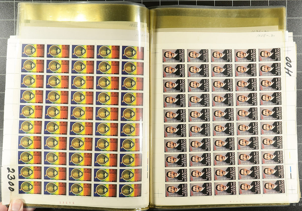 Latin America mixed assortment of mint, used, complete panes, from several previous bidboards, and part of a local estate. Noted Uruguay (large blocks Kennedy, football, etc.), Cuba (several assorted pages, mostly CTO), a nice batch of souvenir sheets from Chile, Paraguay (scouting), Brazil circa 1990, a mounted collection of used Argentina, concluding with a mint sheet file of Mexico with panes from 1960-1980 (catalogues US$500+). Uncommon material. Estimate =