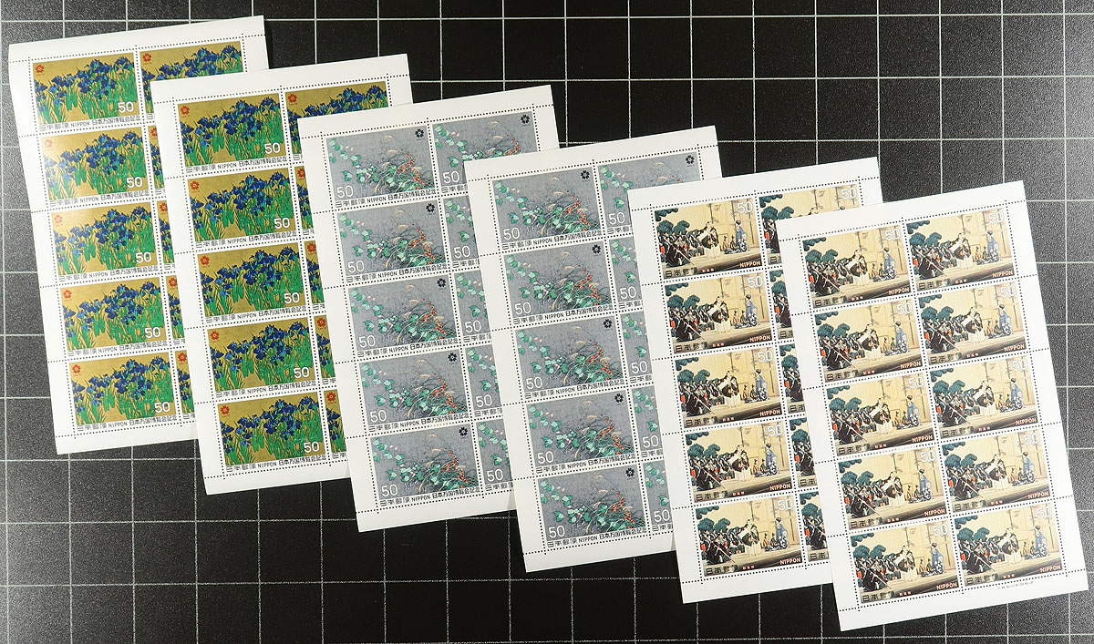Complete mint, never hinged panes of 10-20 stamps, with issues from 1969-1971, and then 1985-1992. A popular sideline for modern Japanese collectors. These have significant face value (totals over ¥40,000) and are in nice condition. Expect some duplication. Total face value in Canadian dollars =