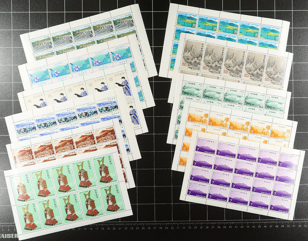 Complete mint, never hinged panes of 10-20 stamps, with issues from 1969-1971, and then 1985-1992. A popular sideline for modern Japanese collectors. These have significant face value (totals over ¥40,000) and are in nice condition. Expect some duplication. Total face value in Canadian dollars =