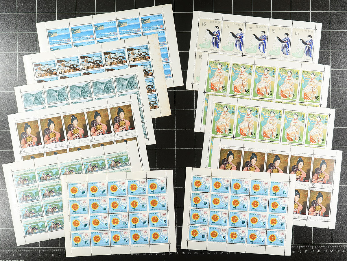 Complete mint, never hinged panes of 10-20 stamps, with issues from 1969-1971, and then 1985-1992. A popular sideline for modern Japanese collectors. These have significant face value (totals over ¥40,000) and are in nice condition. Expect some duplication. Total face value in Canadian dollars =