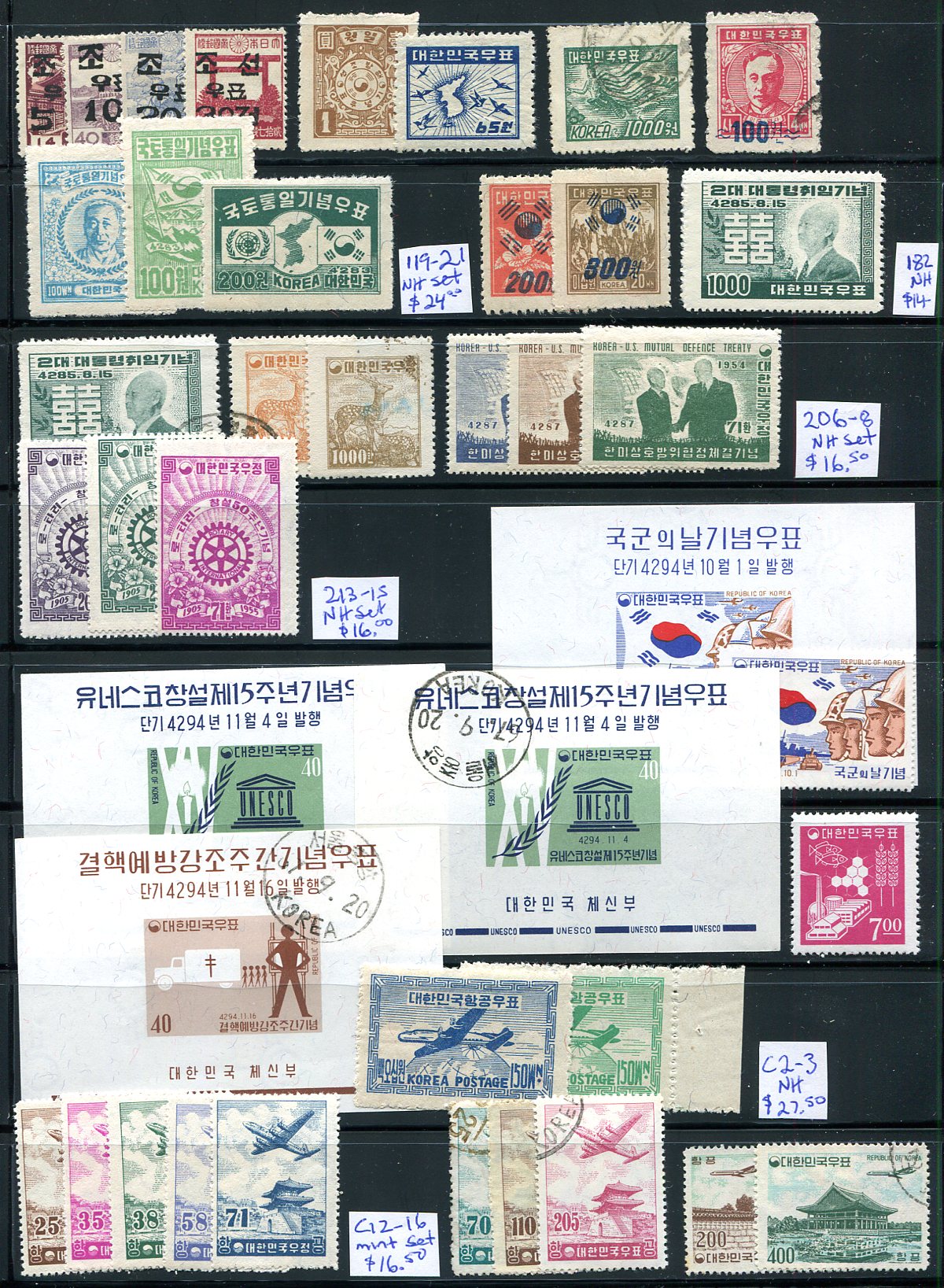 Mostly from the South, a group of four cards, starting with NH blocks of #93 (one hinged) and #94a (good light blue shade), cat US$563.00, followed by an assortment of used and mint from 1936-1961, a half pane of the 1971 UN Organizations issue (a couple with minor creasing) and a few loose items, including a CTO block of North Korea #3488-3512. A nice little group from an emerging collecting juggernaut! Estimate =