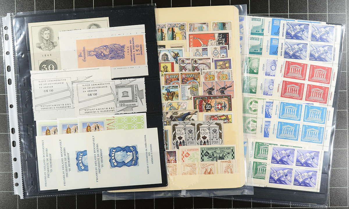 Cinderellas, labels, poster stamps, seals, or whatever you call them. A good handful of stock and album pages, plus some unmanned, from across the globe. We saw "fantasy countries", like Lundy, Sark, Herm, Lihou, Kaulbach Islands (and more!). There is a good batch of worldwide TB/Christmas labels, including some imperfs (and complete panes from Faroe Islands and Greenland). Philatelic exhibitions, UNESCO, WWI patriotic, etc. etc. A couple of thousand stamps (easily) plus some multiples. Not your usual group. Estimate =