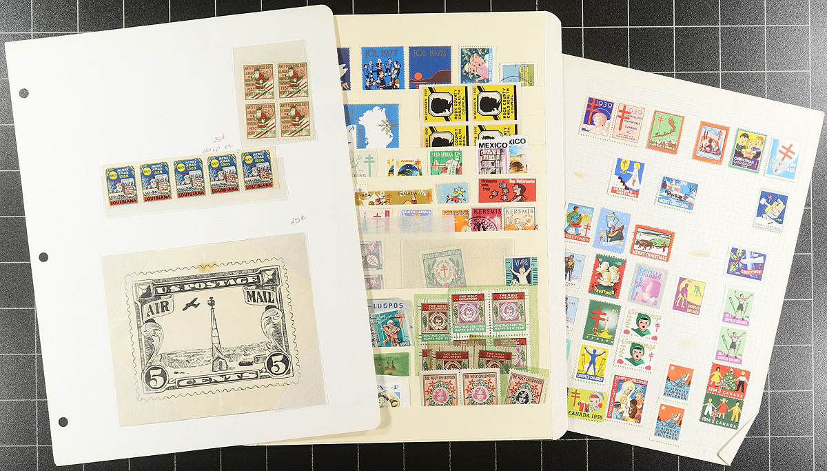Cinderellas, labels, poster stamps, seals, or whatever you call them. A good handful of stock and album pages, plus some unmanned, from across the globe. We saw "fantasy countries", like Lundy, Sark, Herm, Lihou, Kaulbach Islands (and more!). There is a good batch of worldwide TB/Christmas labels, including some imperfs (and complete panes from Faroe Islands and Greenland). Philatelic exhibitions, UNESCO, WWI patriotic, etc. etc. A couple of thousand stamps (easily) plus some multiples. Not your usual group. Estimate =