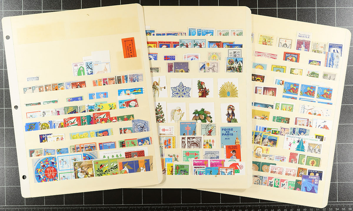 Cinderellas, labels, poster stamps, seals, or whatever you call them. A good handful of stock and album pages, plus some unmanned, from across the globe. We saw "fantasy countries", like Lundy, Sark, Herm, Lihou, Kaulbach Islands (and more!). There is a good batch of worldwide TB/Christmas labels, including some imperfs (and complete panes from Faroe Islands and Greenland). Philatelic exhibitions, UNESCO, WWI patriotic, etc. etc. A couple of thousand stamps (easily) plus some multiples. Not your usual group. Estimate =