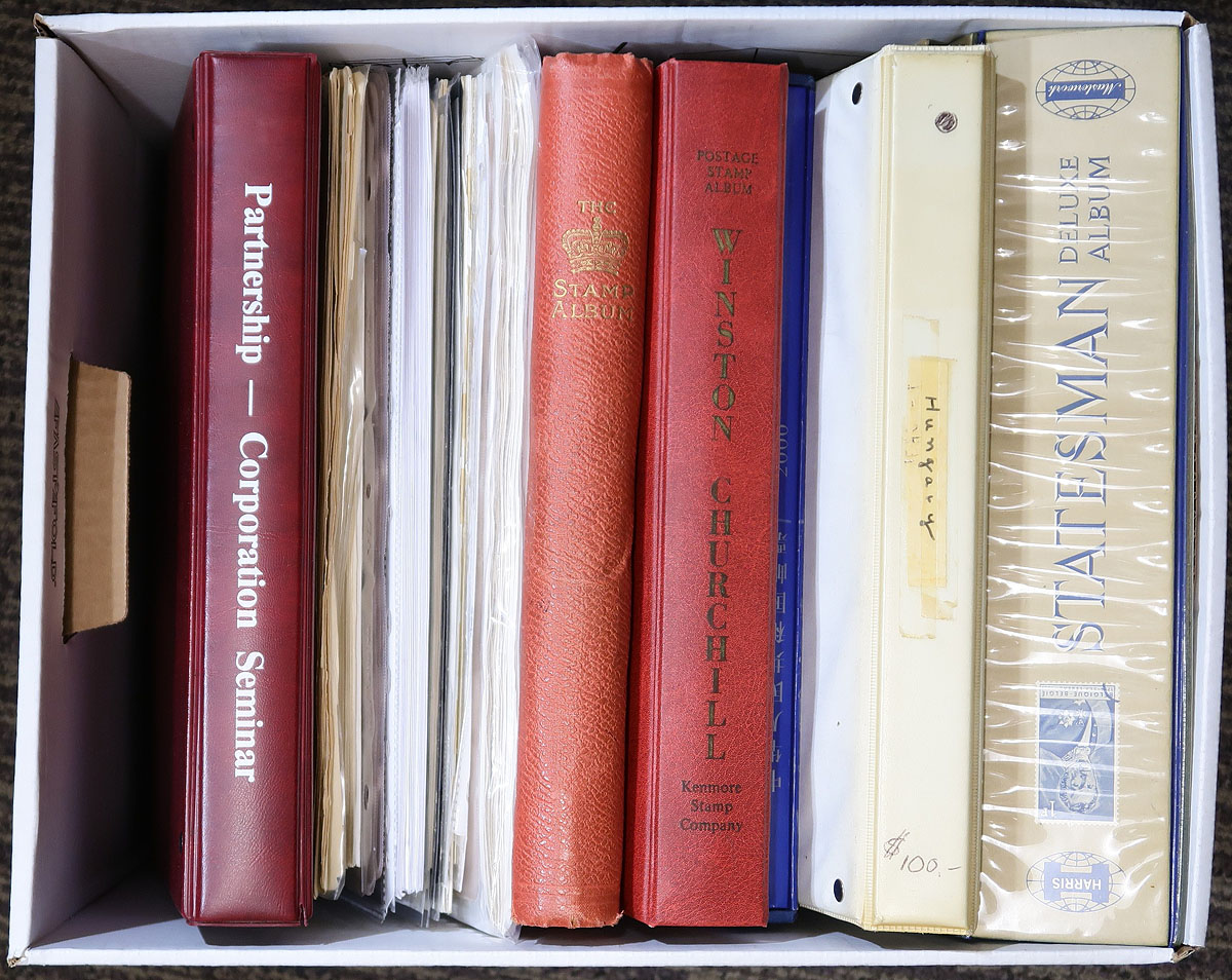 Topical heavy albums and pages in a bankers box. A binder is filled with Scouting (mostly Africa) from 2001-2002, with lots of mini-panes (probably outrageously expensive to buy new), a nice binder of Winston Churchill (1965 and 1974 issues). Mounted collection of Hungary and Greece are here, plus a Statesman and a springback have worldwide issues. There is a PRC 2000 year book. and some loose pages of miscellany. Lots of fun to have here. Estimate =