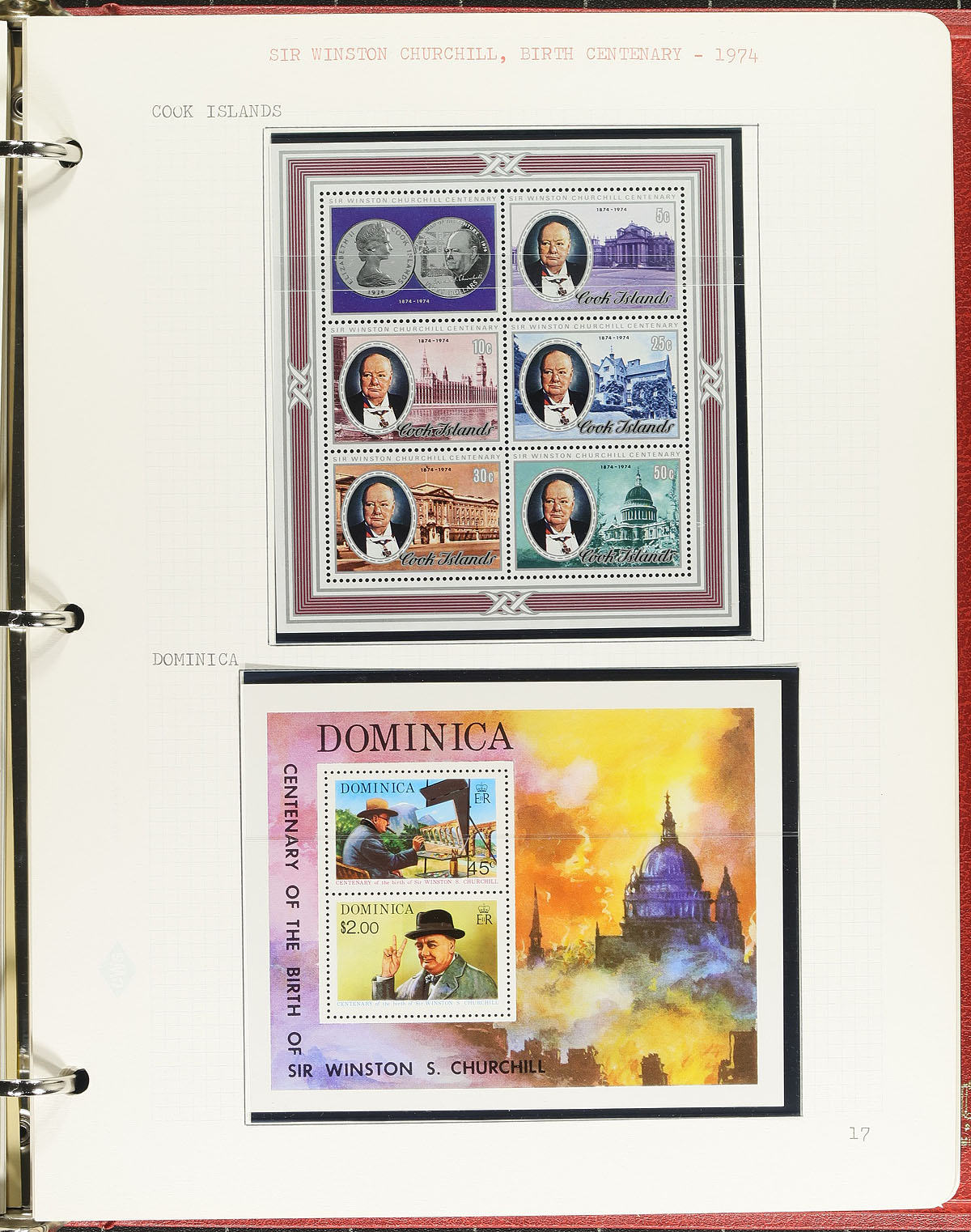 Topical heavy albums and pages in a bankers box. A binder is filled with Scouting (mostly Africa) from 2001-2002, with lots of mini-panes (probably outrageously expensive to buy new), a nice binder of Winston Churchill (1965 and 1974 issues). Mounted collection of Hungary and Greece are here, plus a Statesman and a springback have worldwide issues. There is a PRC 2000 year book. and some loose pages of miscellany. Lots of fun to have here. Estimate =
