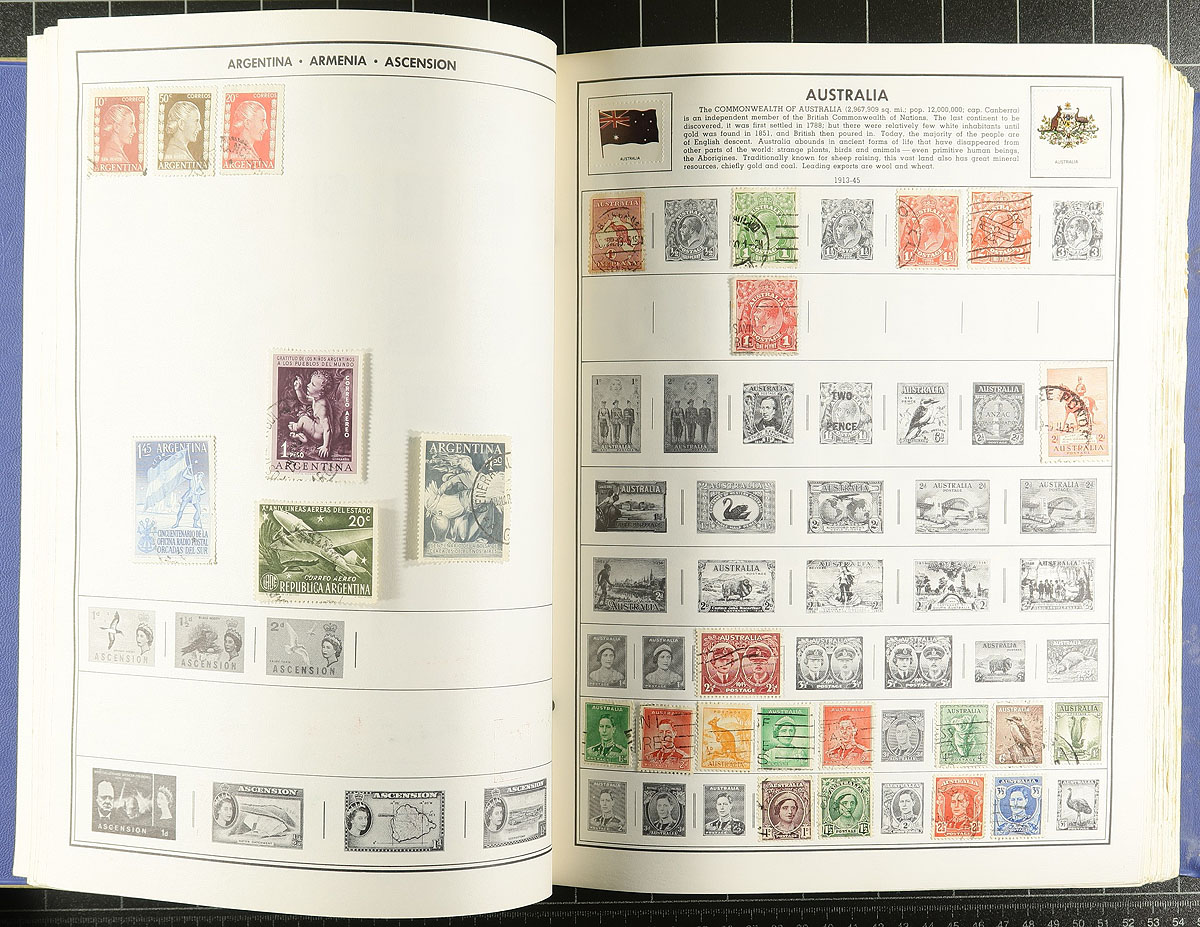 Topical heavy albums and pages in a bankers box. A binder is filled with Scouting (mostly Africa) from 2001-2002, with lots of mini-panes (probably outrageously expensive to buy new), a nice binder of Winston Churchill (1965 and 1974 issues). Mounted collection of Hungary and Greece are here, plus a Statesman and a springback have worldwide issues. There is a PRC 2000 year book. and some loose pages of miscellany. Lots of fun to have here. Estimate =