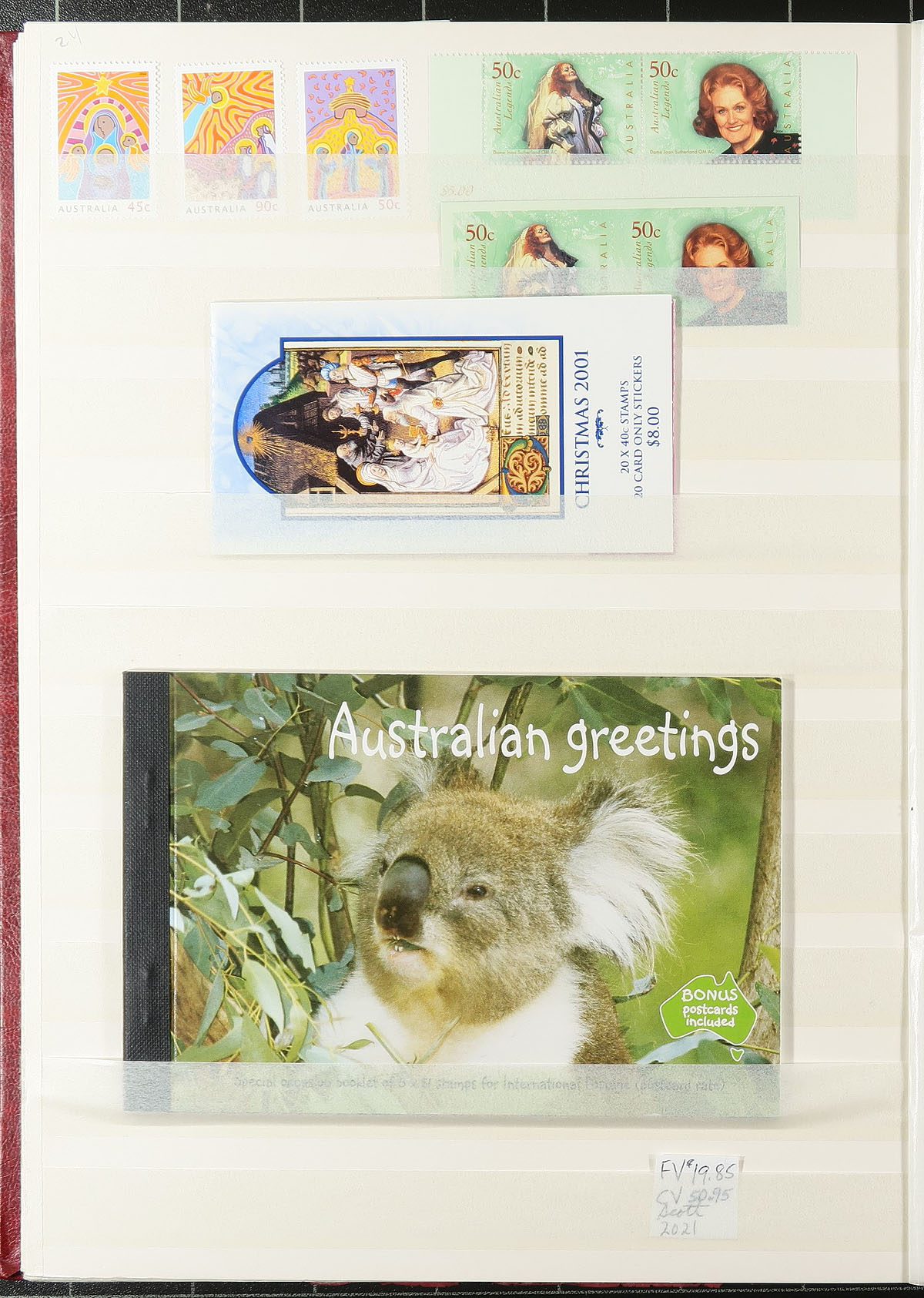 Worn, red 32-page stockbook contains beautiful VF MNH collection of 389 stamps, 9 souvenir sheets and 22 booklets. The odd duplicate noted. 1974-2001 period issues. Catalogue value is over US$750.00. Counted at face value at AUD$362.98 in Canadian Dollars =