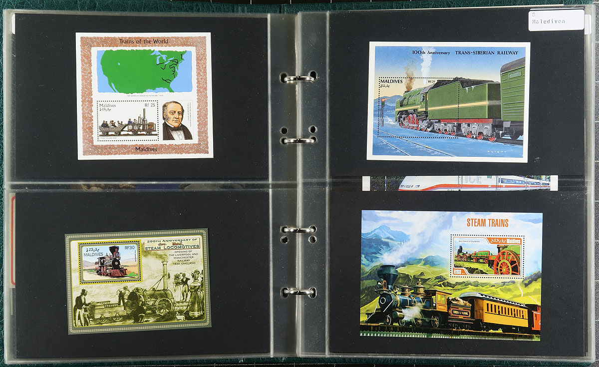 Trains & Railways topical Souvenir Sheets and Blocks. High quality small format album containing over 150 lightly duplicated mint and used souvenir sheets plus a handful of blocks, all Train and Railway themed. Includes a good number of issues from obscure and less often seen countries. This material will add substantially to your railway themed stock/collection/exhibit. Estimate =