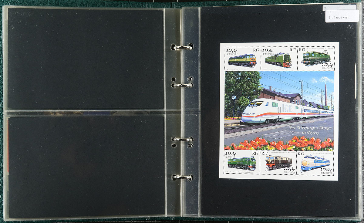 Trains & Railways topical Souvenir Sheets and Blocks. High quality small format album containing over 150 lightly duplicated mint and used souvenir sheets plus a handful of blocks, all Train and Railway themed. Includes a good number of issues from obscure and less often seen countries. This material will add substantially to your railway themed stock/collection/exhibit. Estimate =