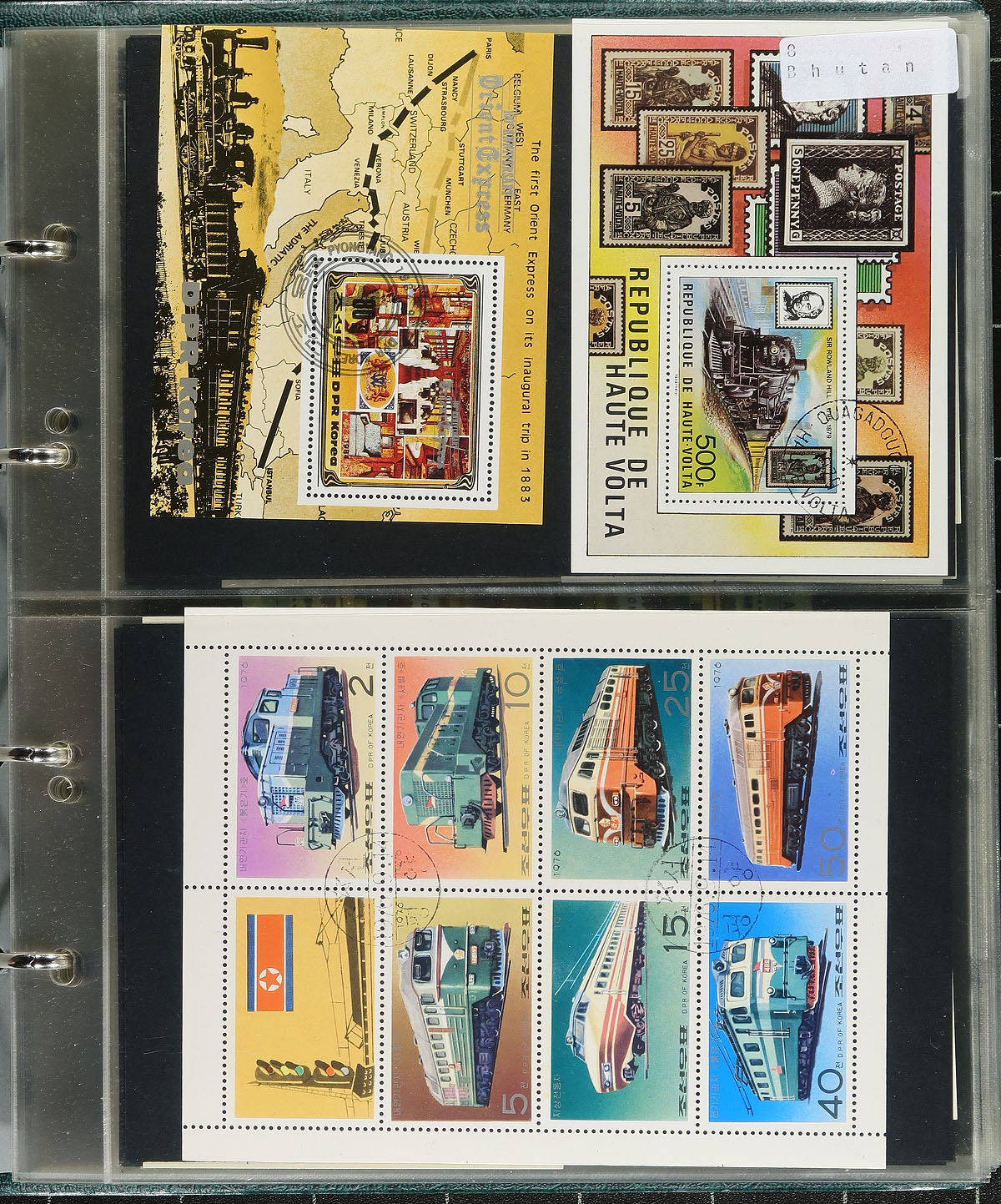 Trains & Railways topical Souvenir Sheets and Blocks. High quality small format album containing over 150 lightly duplicated mint and used souvenir sheets plus a handful of blocks, all Train and Railway themed. Includes a good number of issues from obscure and less often seen countries. This material will add substantially to your railway themed stock/collection/exhibit. Estimate =