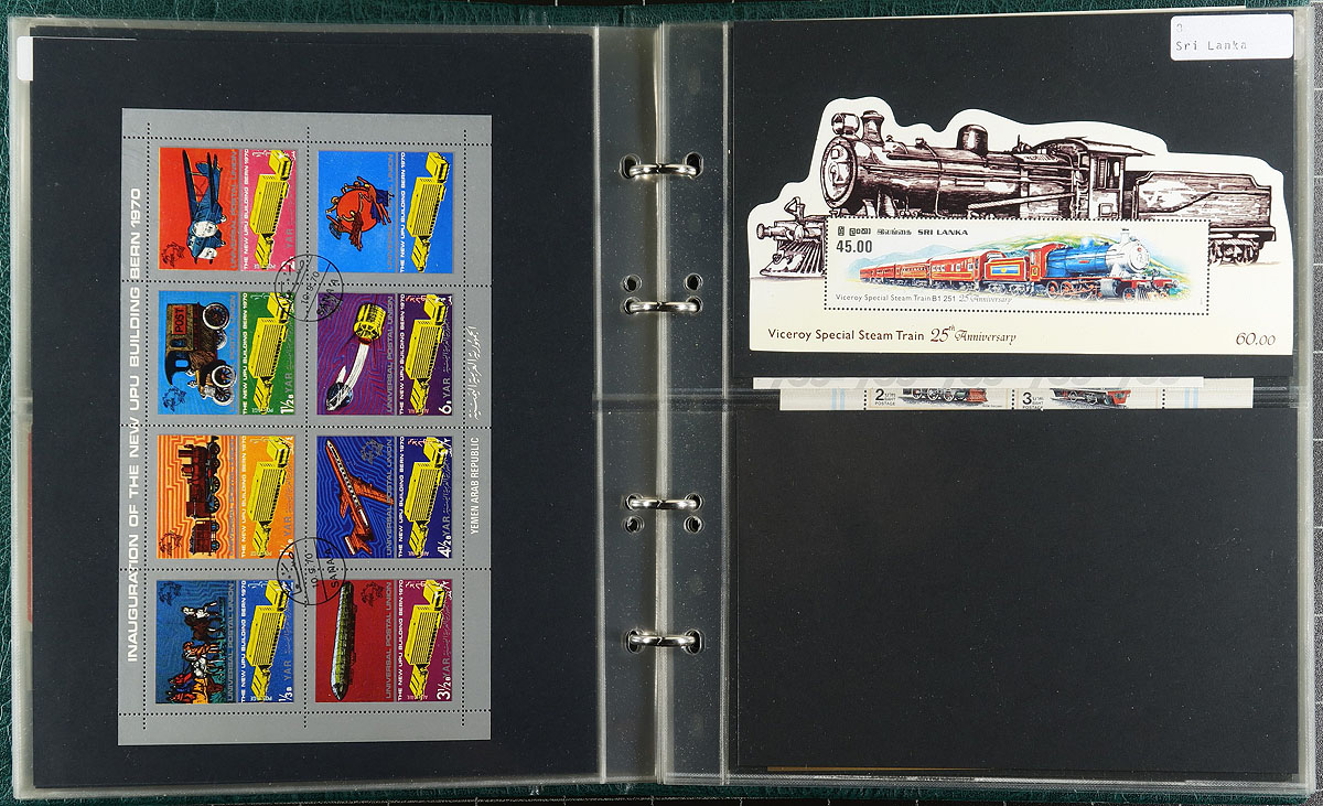 Trains & Railways topical Souvenir Sheets and Blocks. High quality small format album containing over 150 lightly duplicated mint and used souvenir sheets plus a handful of blocks, all Train and Railway themed. Includes a good number of issues from obscure and less often seen countries. This material will add substantially to your railway themed stock/collection/exhibit. Estimate =