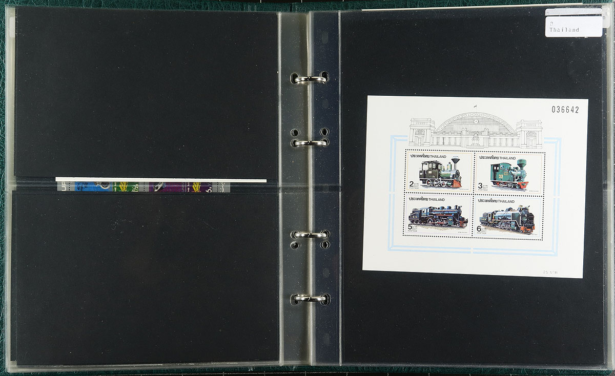 Trains & Railways topical Souvenir Sheets and Blocks. High quality small format album containing over 150 lightly duplicated mint and used souvenir sheets plus a handful of blocks, all Train and Railway themed. Includes a good number of issues from obscure and less often seen countries. This material will add substantially to your railway themed stock/collection/exhibit. Estimate =