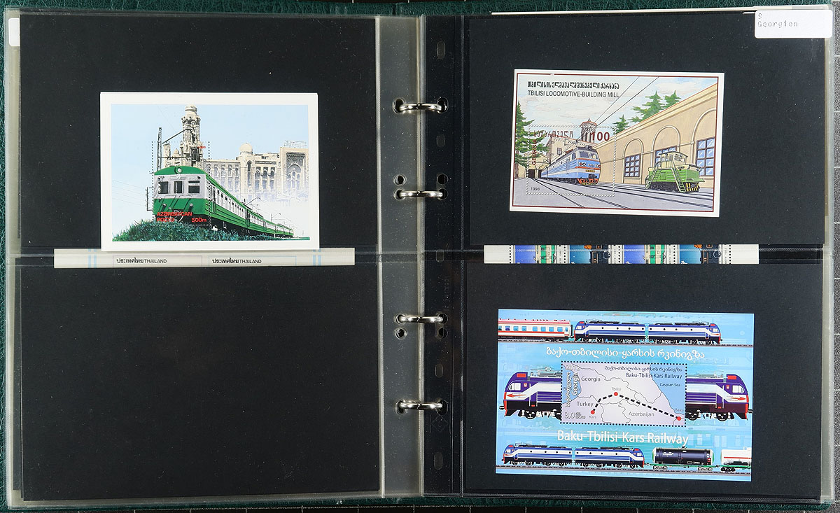 Trains & Railways topical Souvenir Sheets and Blocks. High quality small format album containing over 150 lightly duplicated mint and used souvenir sheets plus a handful of blocks, all Train and Railway themed. Includes a good number of issues from obscure and less often seen countries. This material will add substantially to your railway themed stock/collection/exhibit. Estimate =