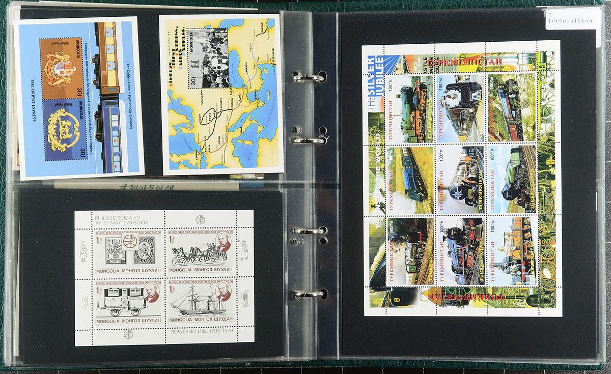 Trains & Railways topical Souvenir Sheets and Blocks. High quality small format album containing over 150 lightly duplicated mint and used souvenir sheets plus a handful of blocks, all Train and Railway themed. Includes a good number of issues from obscure and less often seen countries. This material will add substantially to your railway themed stock/collection/exhibit. Estimate =