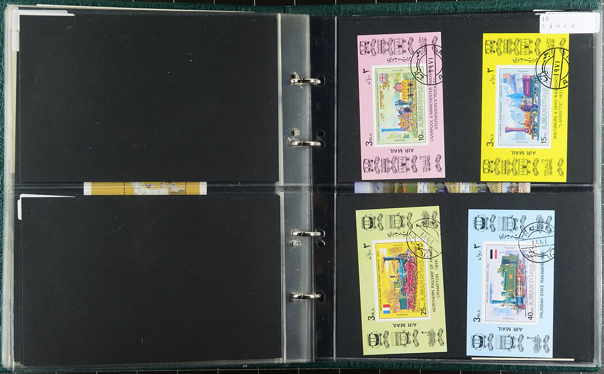 Trains & Railways topical Souvenir Sheets and Blocks. High quality small format album containing over 150 lightly duplicated mint and used souvenir sheets plus a handful of blocks, all Train and Railway themed. Includes a good number of issues from obscure and less often seen countries. This material will add substantially to your railway themed stock/collection/exhibit. Estimate =