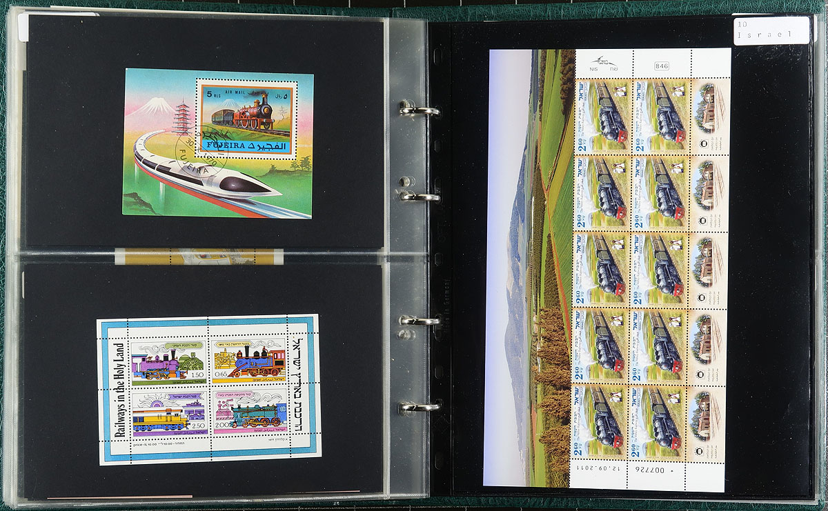 Trains & Railways topical Souvenir Sheets and Blocks. High quality small format album containing over 150 lightly duplicated mint and used souvenir sheets plus a handful of blocks, all Train and Railway themed. Includes a good number of issues from obscure and less often seen countries. This material will add substantially to your railway themed stock/collection/exhibit. Estimate =
