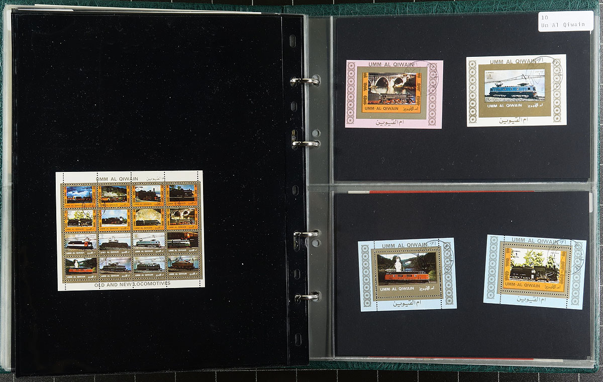 Trains & Railways topical Souvenir Sheets and Blocks. High quality small format album containing over 150 lightly duplicated mint and used souvenir sheets plus a handful of blocks, all Train and Railway themed. Includes a good number of issues from obscure and less often seen countries. This material will add substantially to your railway themed stock/collection/exhibit. Estimate =