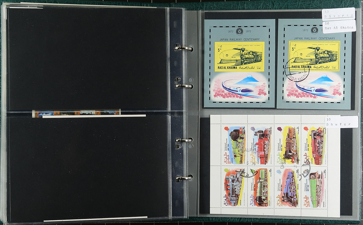 Trains & Railways topical Souvenir Sheets and Blocks. High quality small format album containing over 150 lightly duplicated mint and used souvenir sheets plus a handful of blocks, all Train and Railway themed. Includes a good number of issues from obscure and less often seen countries. This material will add substantially to your railway themed stock/collection/exhibit. Estimate =