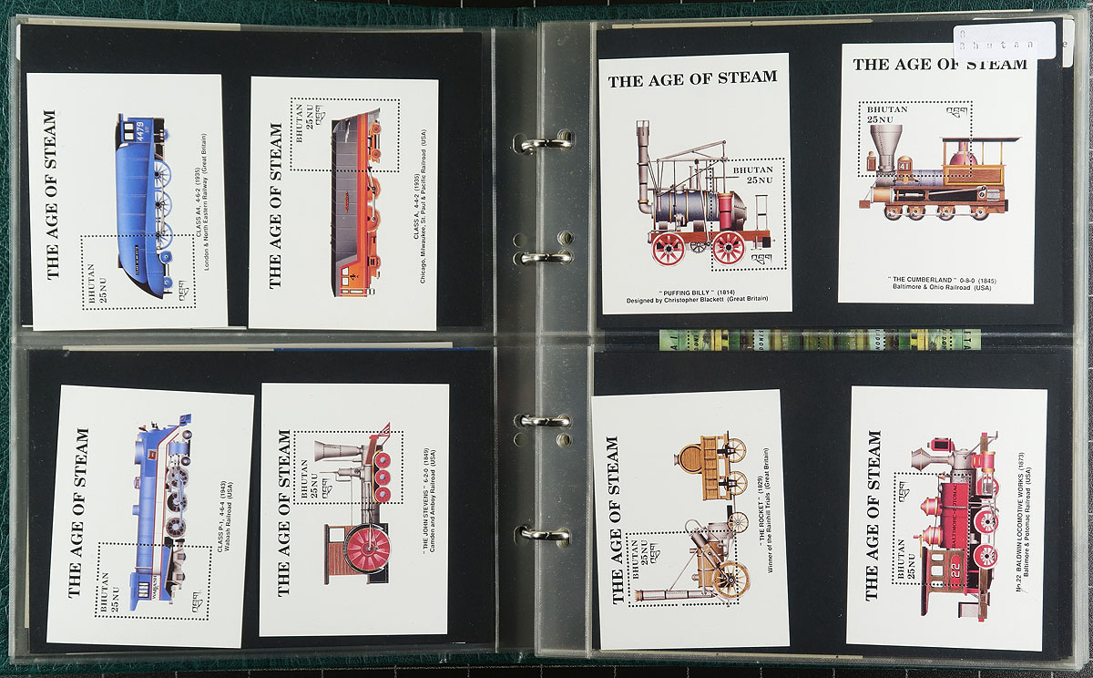 Trains & Railways topical Souvenir Sheets and Blocks. High quality small format album containing over 150 lightly duplicated mint and used souvenir sheets plus a handful of blocks, all Train and Railway themed. Includes a good number of issues from obscure and less often seen countries. This material will add substantially to your railway themed stock/collection/exhibit. Estimate =