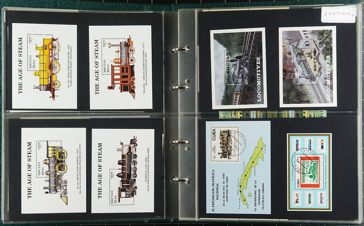 Trains & Railways topical Souvenir Sheets and Blocks. High quality small format album containing over 150 lightly duplicated mint and used souvenir sheets plus a handful of blocks, all Train and Railway themed. Includes a good number of issues from obscure and less often seen countries. This material will add substantially to your railway themed stock/collection/exhibit. Estimate =