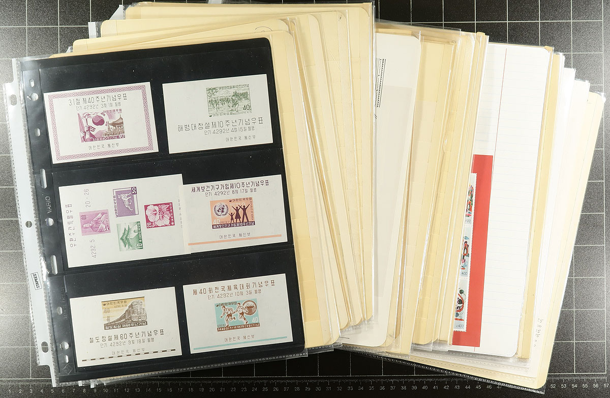 Souvenir Sheet Lovers (Part 1): This collector bought souvenir sheets from almost everywhere and put them on stockpages in page protectors. Mint (mostly never hinged) and a few used. Some were individual lots on local bidboards. Some are in window envelopes (and some of these have multiple sheets that we can’t see!). No Canada, USA or Western Europe, but everywhere else is here, with many great topicals. No organization, so no two pages are related. Fills a 2.5" binder. We note a group of mint Korean souvenir sheets and some Romanian 1940s souvenir sheet, these two alone catalogue US$400.00 plus lots of $5-$20 items, with a few stamps when they are part of the set. Estimated =