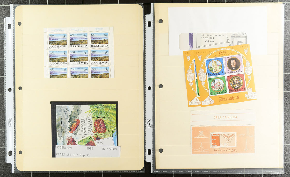 Souvenir Sheet Lovers (Part 1): This collector bought souvenir sheets from almost everywhere and put them on stockpages in page protectors. Mint (mostly never hinged) and a few used. Some were individual lots on local bidboards. Some are in window envelopes (and some of these have multiple sheets that we can’t see!). No Canada, USA or Western Europe, but everywhere else is here, with many great topicals. No organization, so no two pages are related. Fills a 2.5" binder. We note a group of mint Korean souvenir sheets and some Romanian 1940s souvenir sheet, these two alone catalogue US$400.00 plus lots of $5-$20 items, with a few stamps when they are part of the set. Estimated =