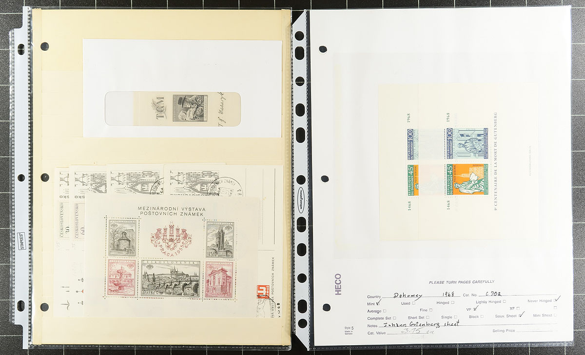 Souvenir Sheet Lovers (Part 1): This collector bought souvenir sheets from almost everywhere and put them on stockpages in page protectors. Mint (mostly never hinged) and a few used. Some were individual lots on local bidboards. Some are in window envelopes (and some of these have multiple sheets that we can’t see!). No Canada, USA or Western Europe, but everywhere else is here, with many great topicals. No organization, so no two pages are related. Fills a 2.5" binder. We note a group of mint Korean souvenir sheets and some Romanian 1940s souvenir sheet, these two alone catalogue US$400.00 plus lots of $5-$20 items, with a few stamps when they are part of the set. Estimated =