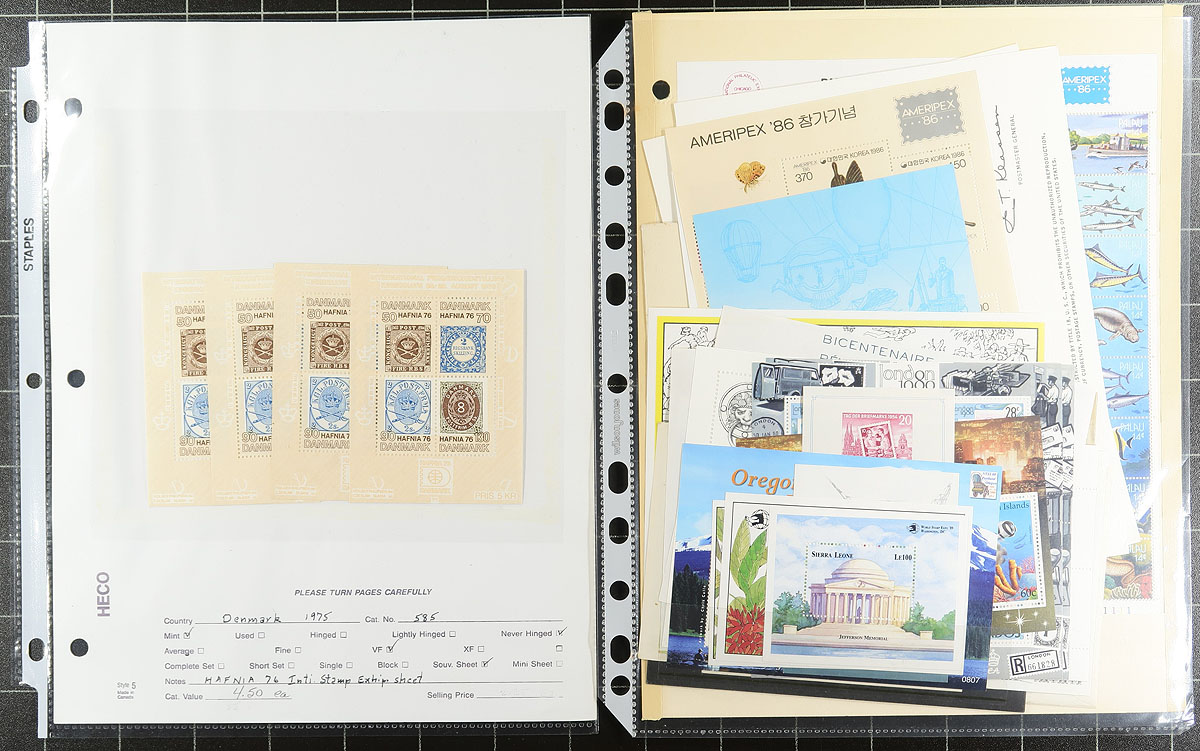 Souvenir Sheet Lovers (Part 2): This collector bought souvenir sheets from almost everywhere and put them on stockpages in page protectors. Mint (mostly never hinged) and a few used. Some were individual lots on local bidboards. Some are in window envelopes (and some of these have multiple sheets that we can’t see!). No Canada, USA or Western Europe, but everywhere else is here, with many great topicals. No organization, so no two pages are related. Fills a 2.5" binder. We note Brazil 1983 International Stamp Show, Chad 1977 Viking Spaceship (#C222 sheetlets), a couple of 1999 Georgia Europa panes, which alone catalogue almost US$500.00 plus lots of $5-$20 items, with a few stamps when they are part of the set. Estimate =