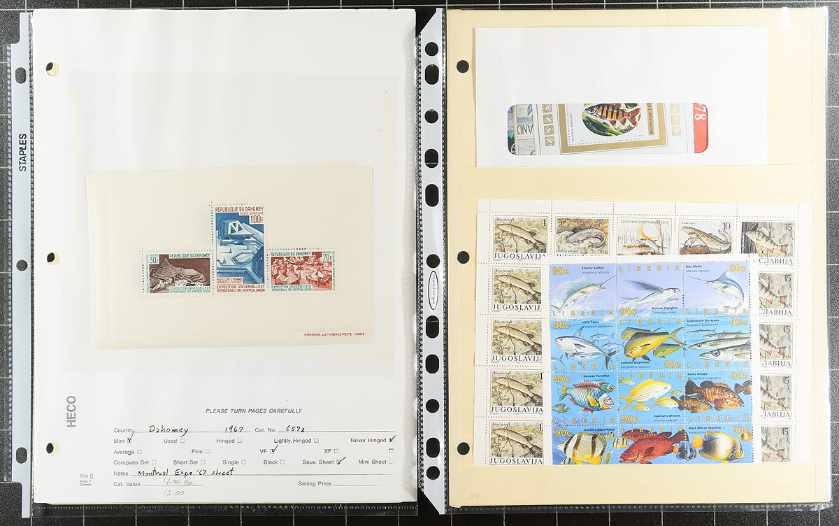 Souvenir Sheet Lovers (Part 2): This collector bought souvenir sheets from almost everywhere and put them on stockpages in page protectors. Mint (mostly never hinged) and a few used. Some were individual lots on local bidboards. Some are in window envelopes (and some of these have multiple sheets that we can’t see!). No Canada, USA or Western Europe, but everywhere else is here, with many great topicals. No organization, so no two pages are related. Fills a 2.5" binder. We note Brazil 1983 International Stamp Show, Chad 1977 Viking Spaceship (#C222 sheetlets), a couple of 1999 Georgia Europa panes, which alone catalogue almost US$500.00 plus lots of $5-$20 items, with a few stamps when they are part of the set. Estimate =