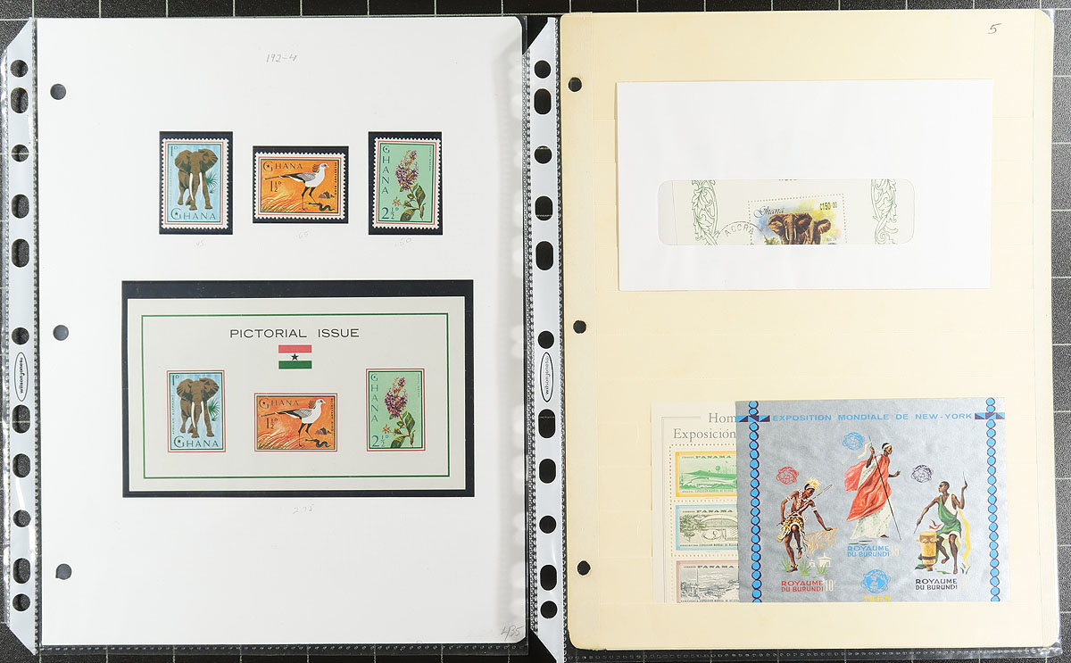 Souvenir Sheet Lovers (Part 2): This collector bought souvenir sheets from almost everywhere and put them on stockpages in page protectors. Mint (mostly never hinged) and a few used. Some were individual lots on local bidboards. Some are in window envelopes (and some of these have multiple sheets that we can’t see!). No Canada, USA or Western Europe, but everywhere else is here, with many great topicals. No organization, so no two pages are related. Fills a 2.5" binder. We note Brazil 1983 International Stamp Show, Chad 1977 Viking Spaceship (#C222 sheetlets), a couple of 1999 Georgia Europa panes, which alone catalogue almost US$500.00 plus lots of $5-$20 items, with a few stamps when they are part of the set. Estimate =